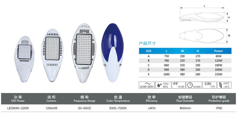 LED 60W-220W 120lm/W 50-60Hz 5000-7000K >90% Φ60mm IP66